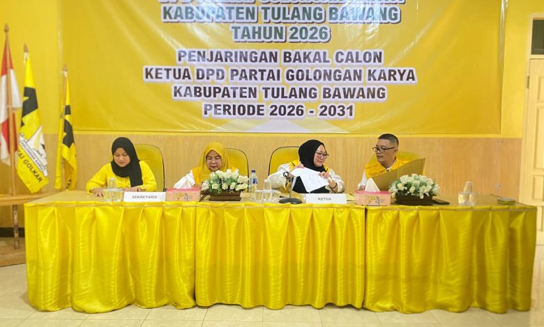 “perlu kami sampaikan bahwa DPD Partai Golkar Kabupaten Tulang Bawang membuka penjaringan Bakal Calon Ketua DPD Partai Golkar Kabupaten Tulang Bawang. Untuk pengambilan formulir dijadwalkan pada hari Senin, (27/04/26) dan untuk pengembalian formulir pendaftaran pada hari Selasa, (28/04/26) bertempat di Kantor Golkar Kabupaten Tulang Bawang” terang Ernawati.