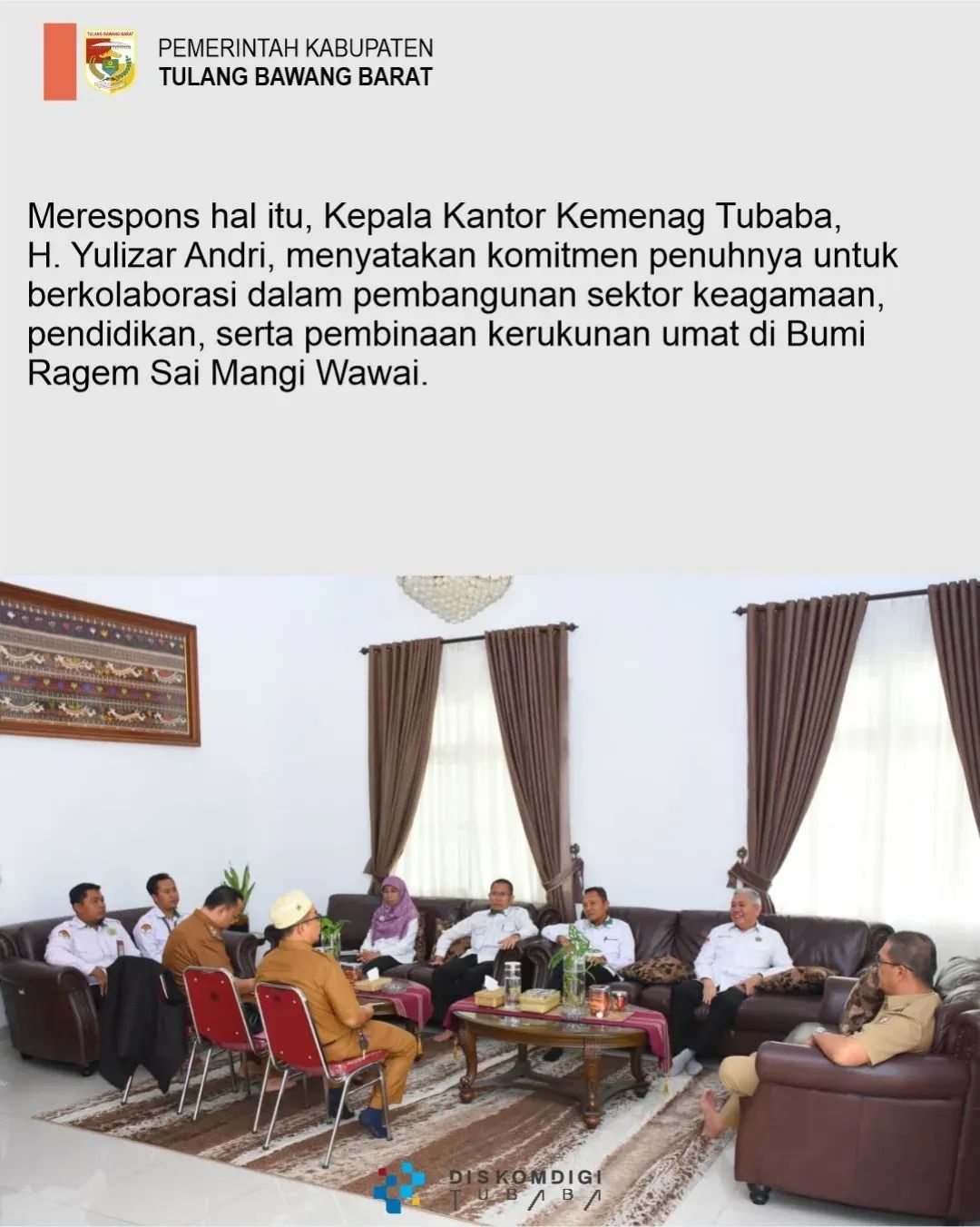 Melalui sinergi antara Pemkab Tubaba dan Kemenag, diharapkan pelayanan keagamaan, pembinaan umat, serta program sosial kemasyarakatan dapat berjalan lebih optimal di Bumi Ragem Sai Mangi Wawai.(Diskon)