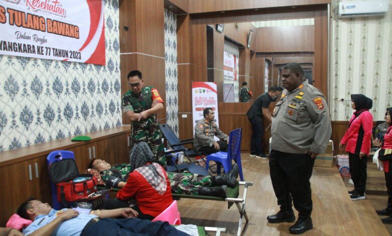 MENGGALA – Melalui Donor Darah Bersama Dalam rangka menyambut HUT Bhayangkara Ke-77 Polres Tulang Bawang menyelenggarakan kegiatan donor darah sebagai wujud sinergitas antara TNI-Polri. Kodim 0426 Tulang Bawang mengerahkan anggota untuk ikut serta dalam kegiatan donor darah, Sabtu 17 Juni 2023.
